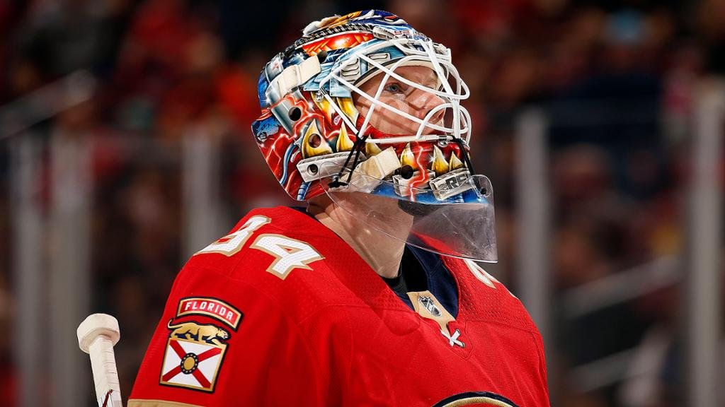 Минималистичный шлем голкипера «Пантерз» исполнен в трех цветах: белом, золотом и темно-синем. Пантера, номер голкипера на подбородке и внутренняя отделка выполнены в золотистом цвете. Синяя защитная сетка и такого же цвета окантовка номера связывают воедино весь дизайн.